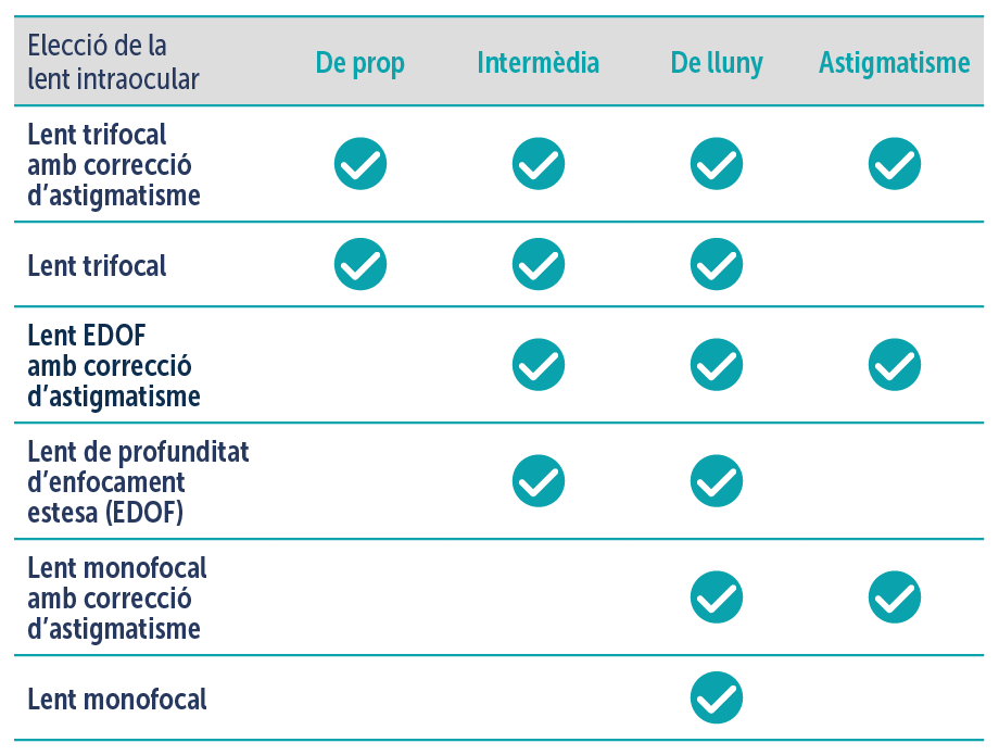 L’elecció del tipus de lent dependrà de les expectatives de qualitat de visió del pacient i diversos condicionants com ara l’existència d’altres malalties oculars, l’edat, l’activitat professional o el dia a dia de la persona que s’ha d’operar.