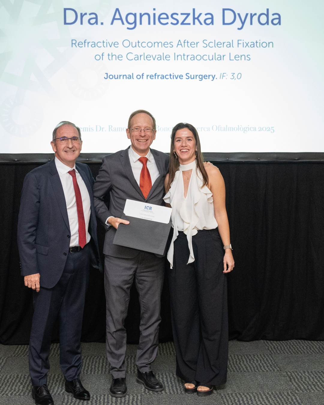 El segundo premio de la categoría de oftalmología fue para “Refractive Outcomes After Scleral Fixation of the Carlevale Intraocular Lens”, un trabajo que firma la Dra. Agniezska Dyrda. En el artículo, publicado en el Journal of Refractive Surgery, también participó el Dr. Ignasi Jürgens, Director Médico de ICR, quien recogió el premio en ausencia de la autora principal.