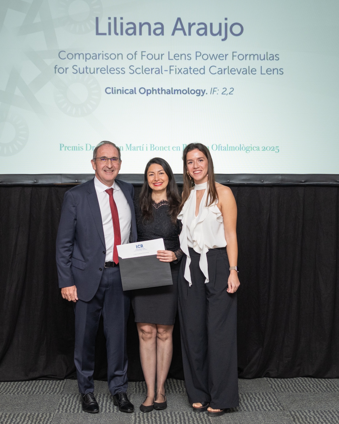 El trabajo merecedor del premio en la categoría de optometristas, auxiliares y enfermería fue “Comparison of Four Lens Power Formulas for Sutureless Scleral-Fixated Carlevale Lens”, de la optometrista Liliana Araujo junto con la Dra. Dyrda. En el mismo también participaron la Dra. Rey, la Dra. Pighin y el Dr. Jürgens.